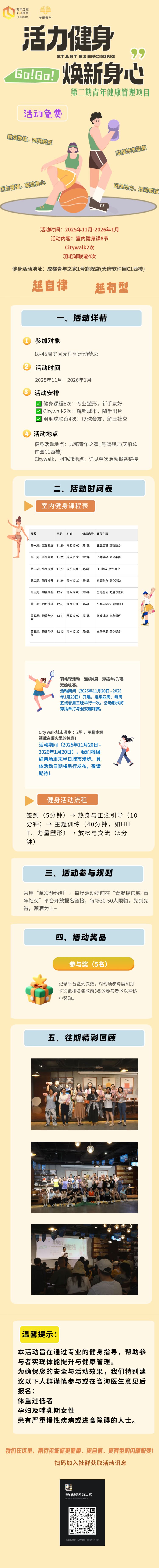 5、本次为系列室内健身课程第7节,活动时间为12月11日(星期四)晚上19:00-20:00,后续课程报名将持续在青聚社交平台发布,敬请关注。