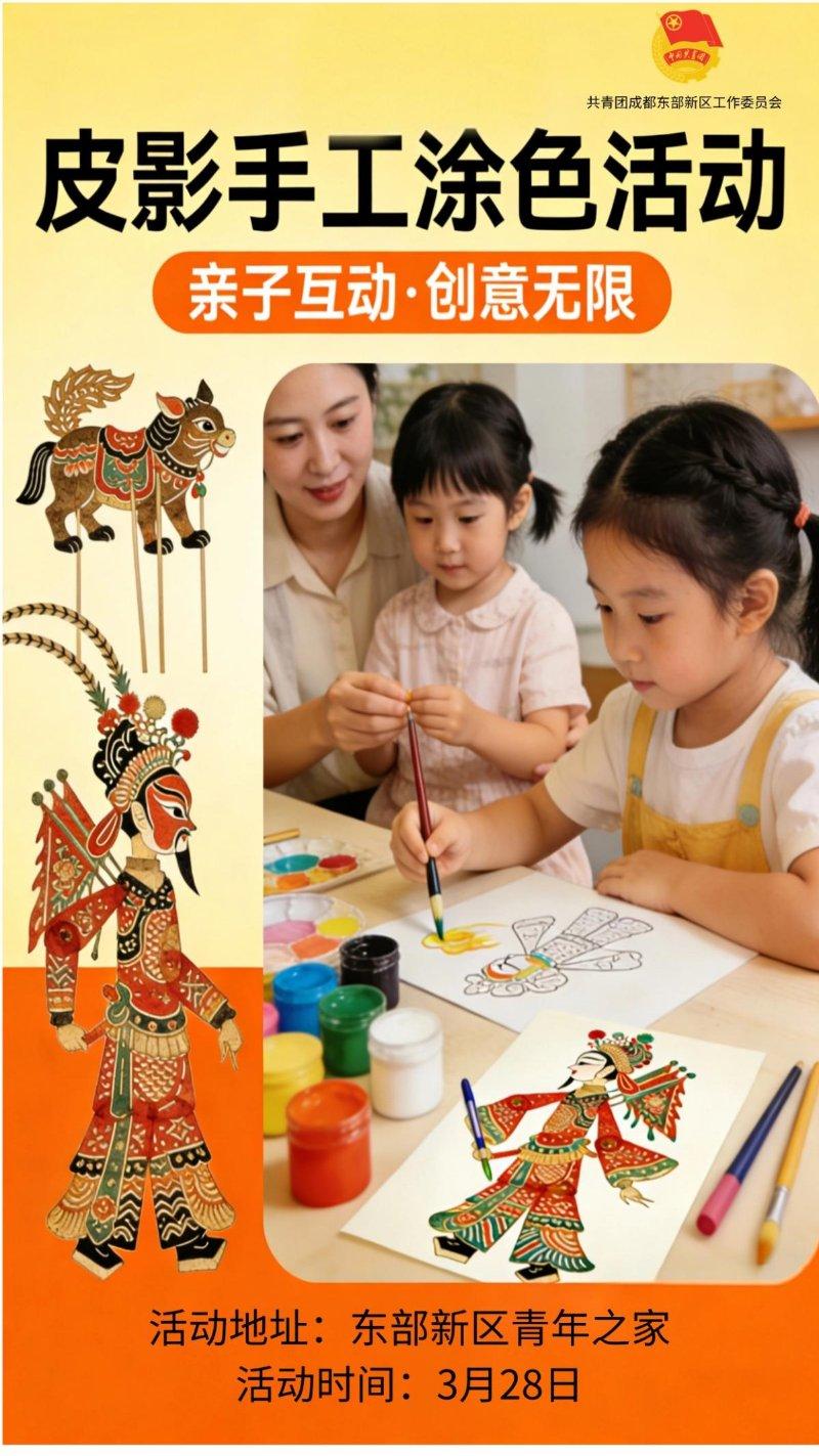 活动由“成都东部新区青年之家”主办,以皮影手工涂色为载体,将非遗文化传承与亲子互动有机结合,不仅让孩子们在动手创作中感受了传统手工艺的魅力,锻炼了创造力和专注力,更让家长们在陪伴中重温了童年乐趣,拉近了亲子距离。下一步,东部新区青年之家将继续深耕非遗文化传承,策划更多形式多样的亲子非遗体验活动,让传统文化在亲子同乐中落地生根、代代相传。