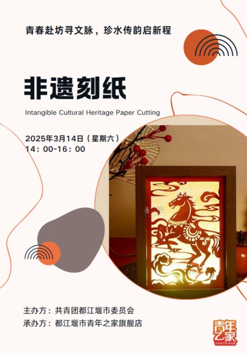 非遗藏古韵,青春赴新程!想沉浸式解锁蜀绣、竹编的千年魅力,亲手制作专属马年纸雕小夜灯,邂逅同频青年、传承本土文化吗?共青团都江堰市委专属非遗体验活动重磅来袭!3 月21日 14:00 开课,全市青年开放 25 个免费名额,带你走进都江堰市珍水万世坊文创产业园,感受传统文化温度,将非遗技艺与马年美好祝愿一同带回家~